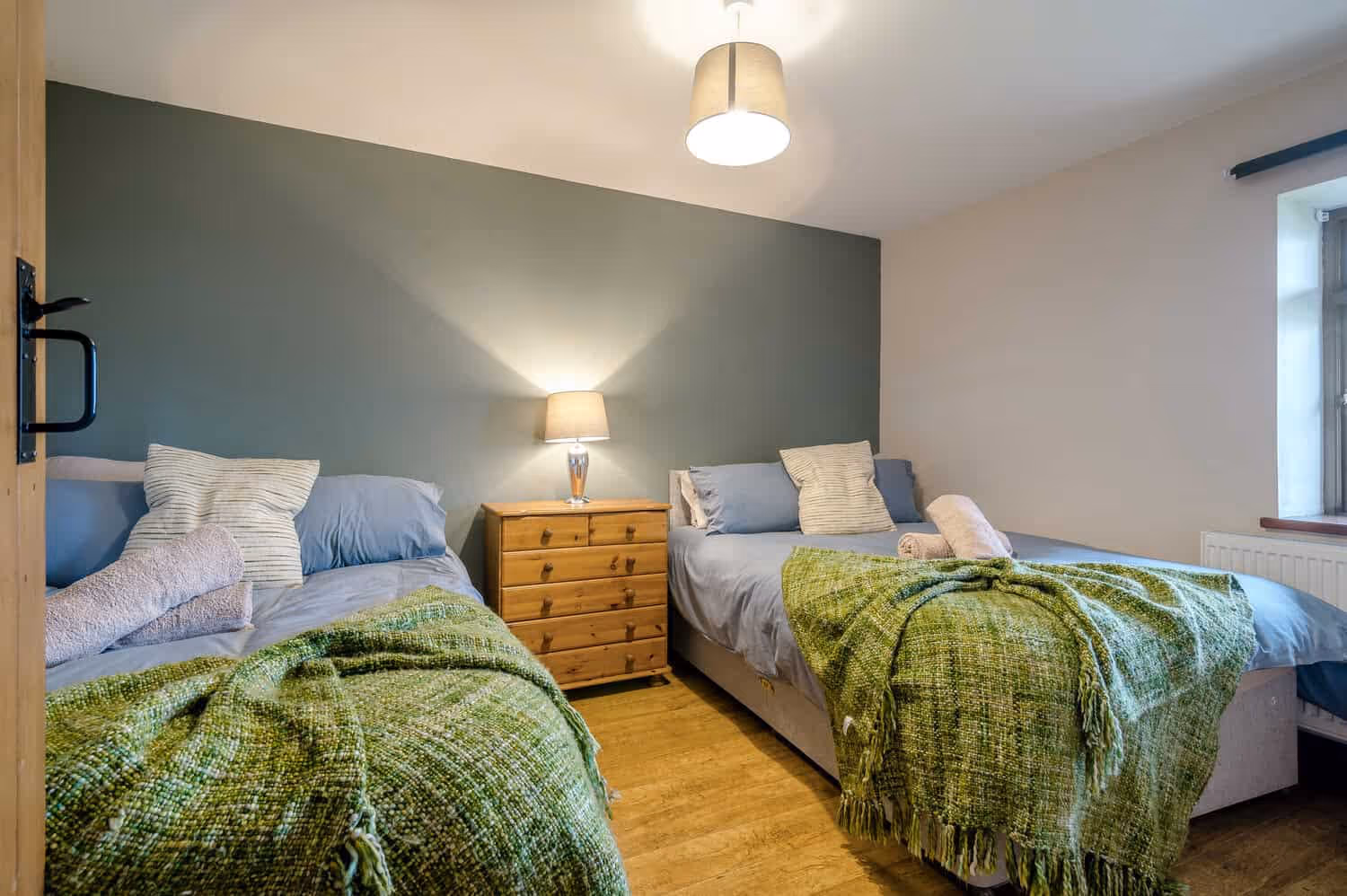 On the ground floor, the spacious bedroom features two double beds, sleeping up to 4 guests, and has space for a travel cot if needed (available free of charge on request). The bathroom includes an electric shower, and a highchair can also be provided on request.